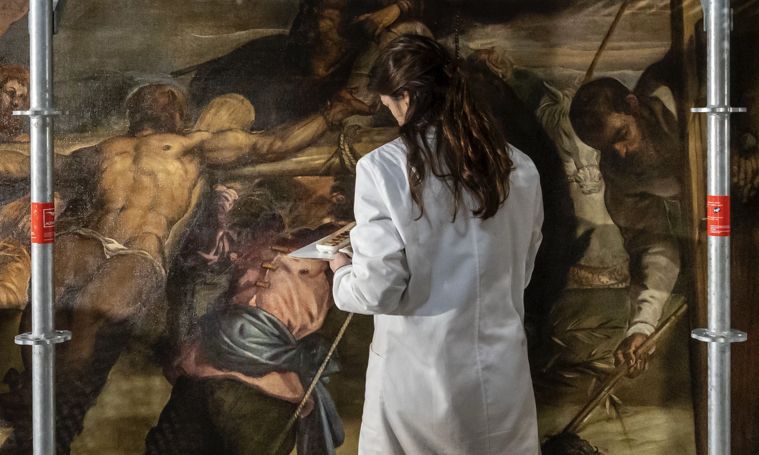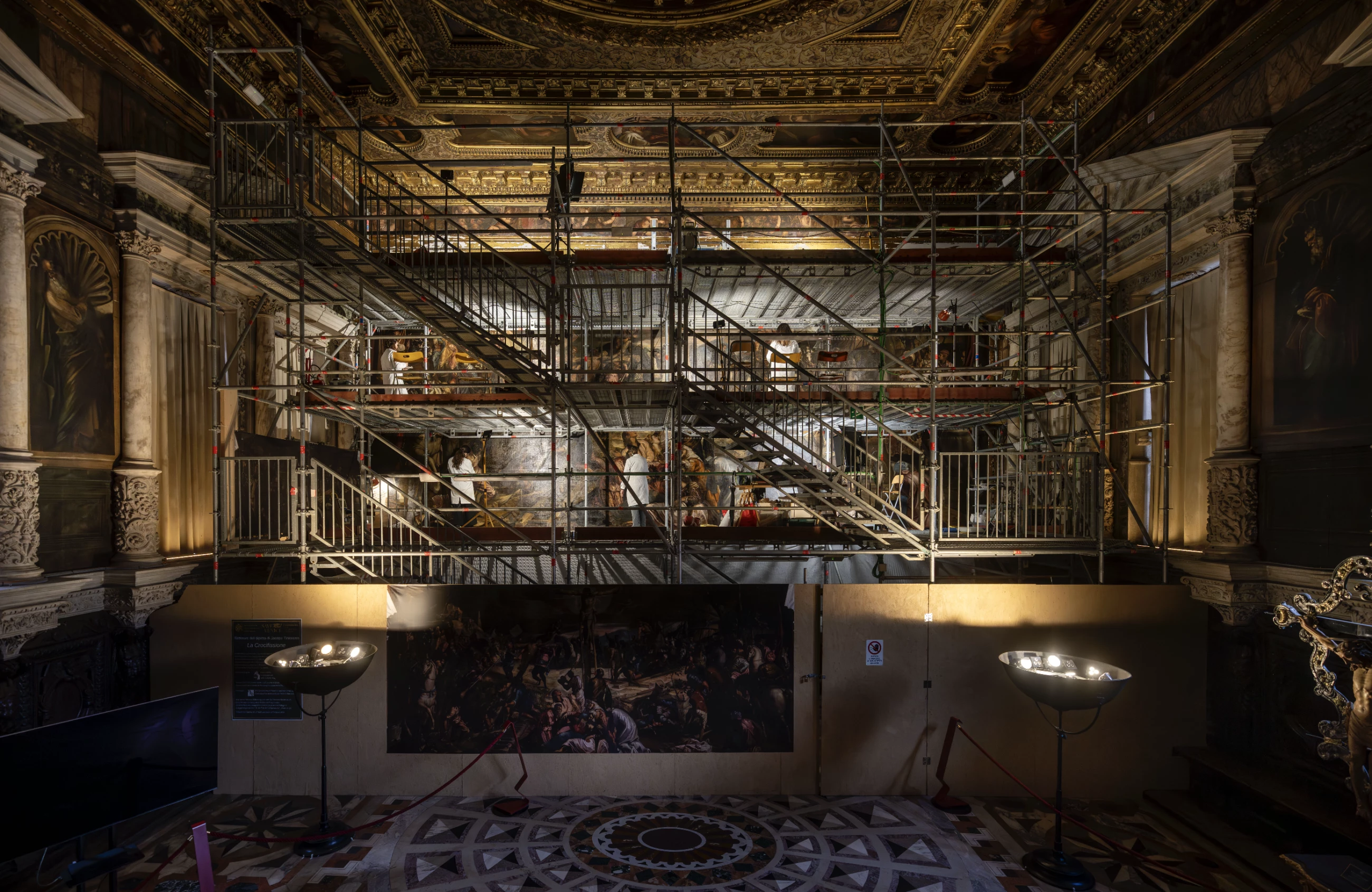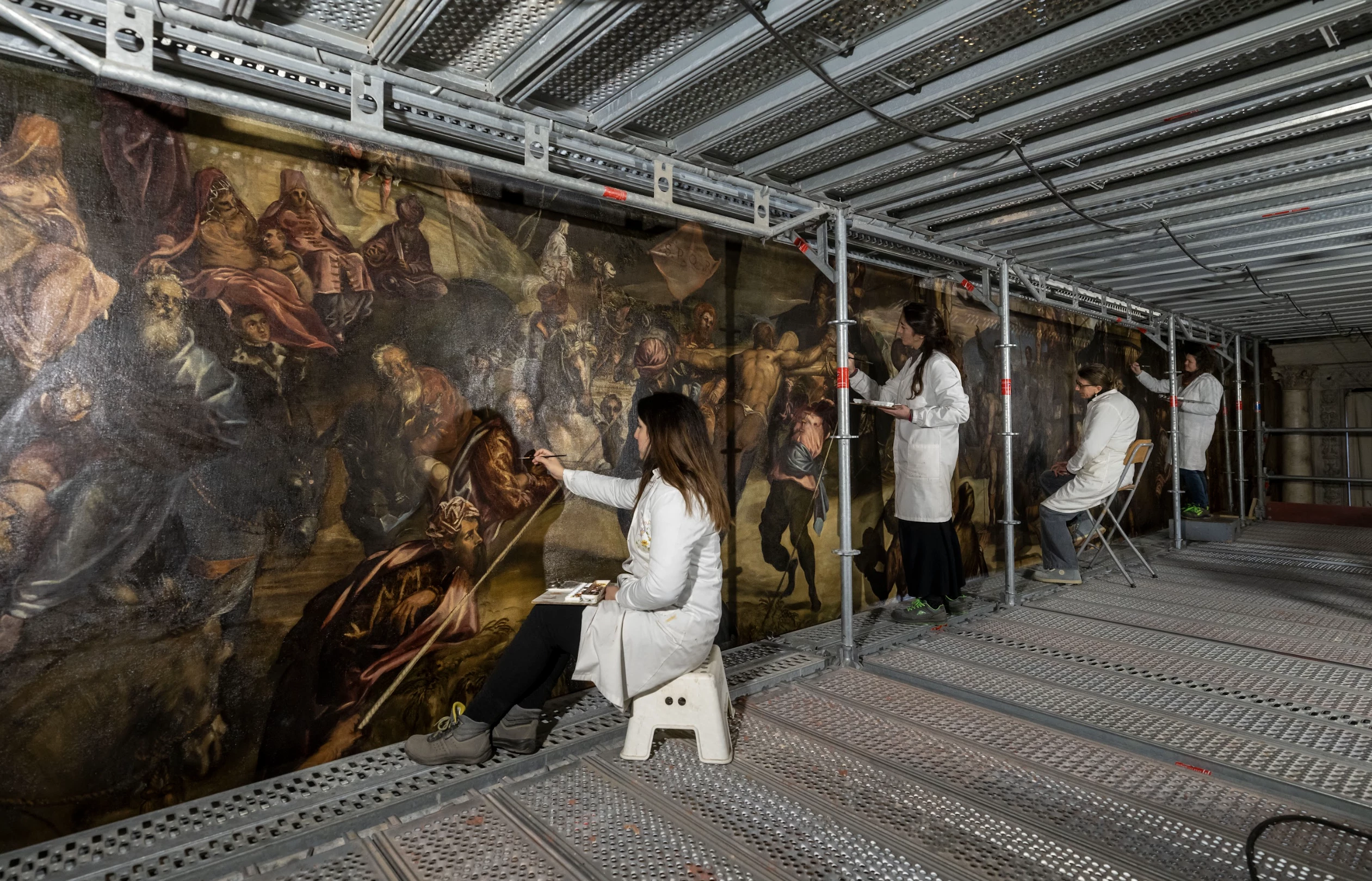 The conservation of Tintoretto’s colossal canvas began in spring 2022 with the installation of a scaffolding structure rising 21 feet high and 40 feet wide. Divided into three levels, it gave CBC conservators full access to every inch of the painting. The towering worksite was designed so that visitors could continue to admire the masterpiece from below, while a video by Giovanni Pellegrini of Ginko Film documented the conservation and shared its progress with the public.
