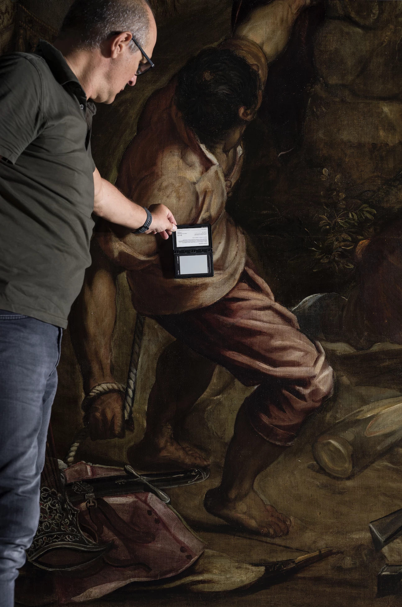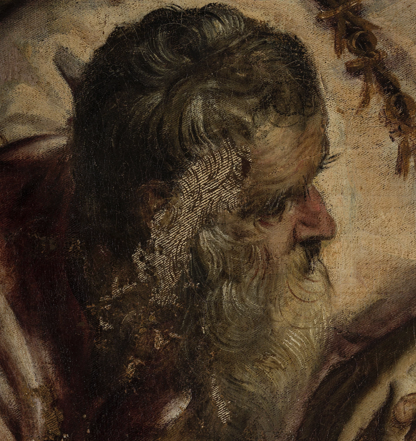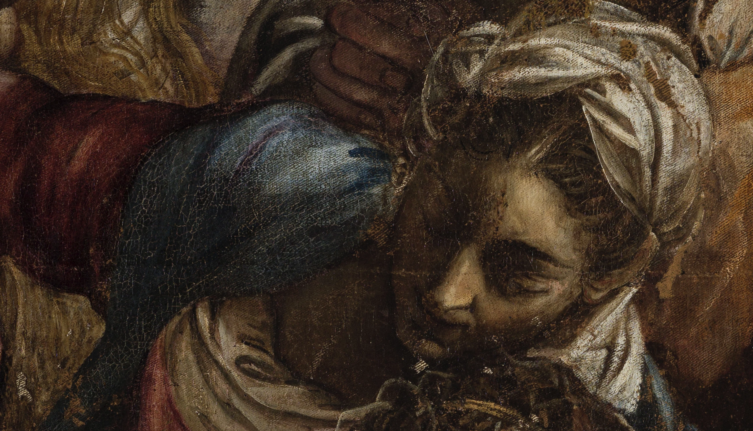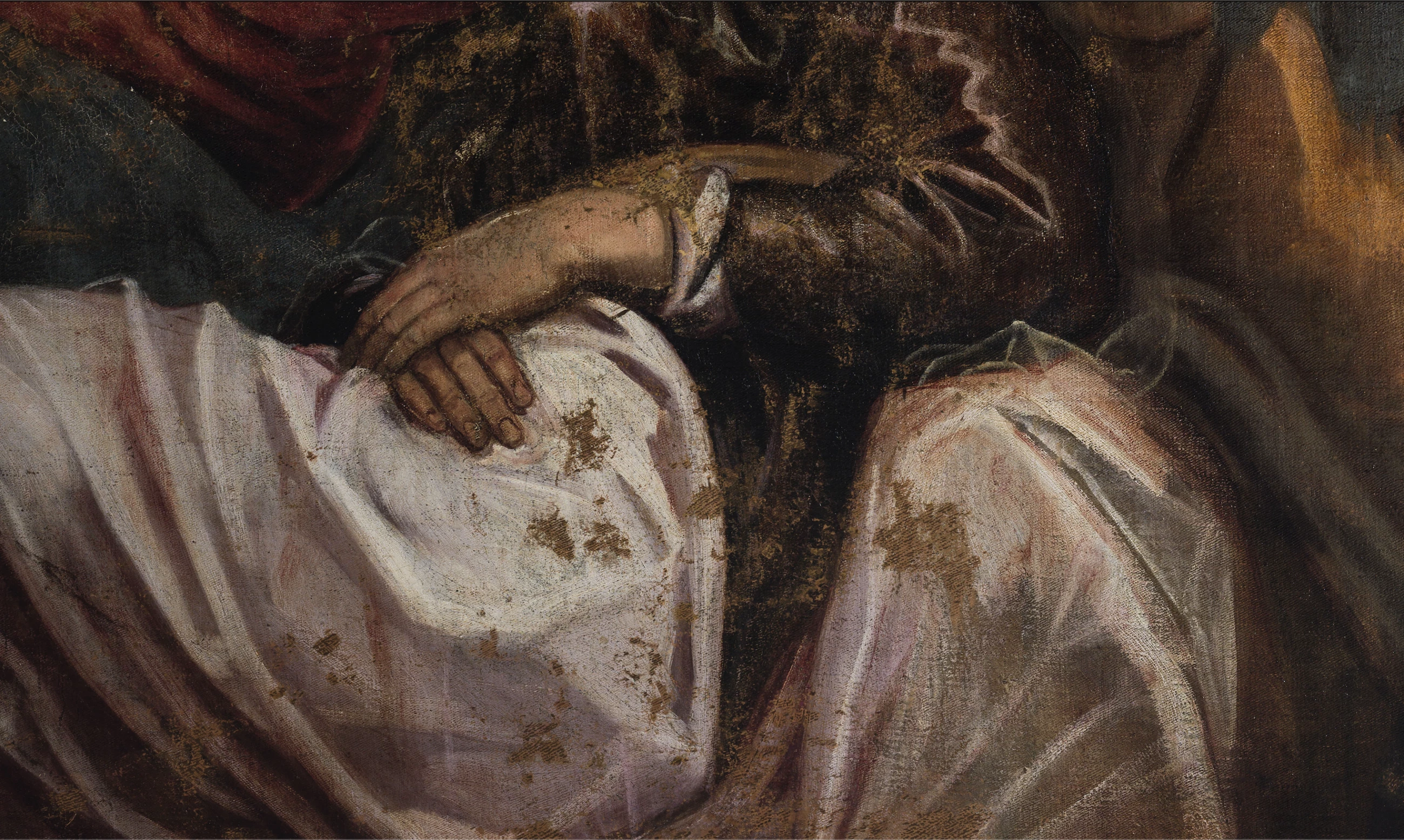 The conservation of Tintoretto’s colossal canvas began in spring 2022 with the installation of a scaffolding structure rising 21 feet high and 40 feet wide. Divided into three levels, it gave CBC conservators full access to every inch of the painting. The towering worksite was designed so that visitors could continue to admire the masterpiece from below, while a video by Giovanni Pellegrini of Ginko Film documented the conservation and shared its progress with the public.