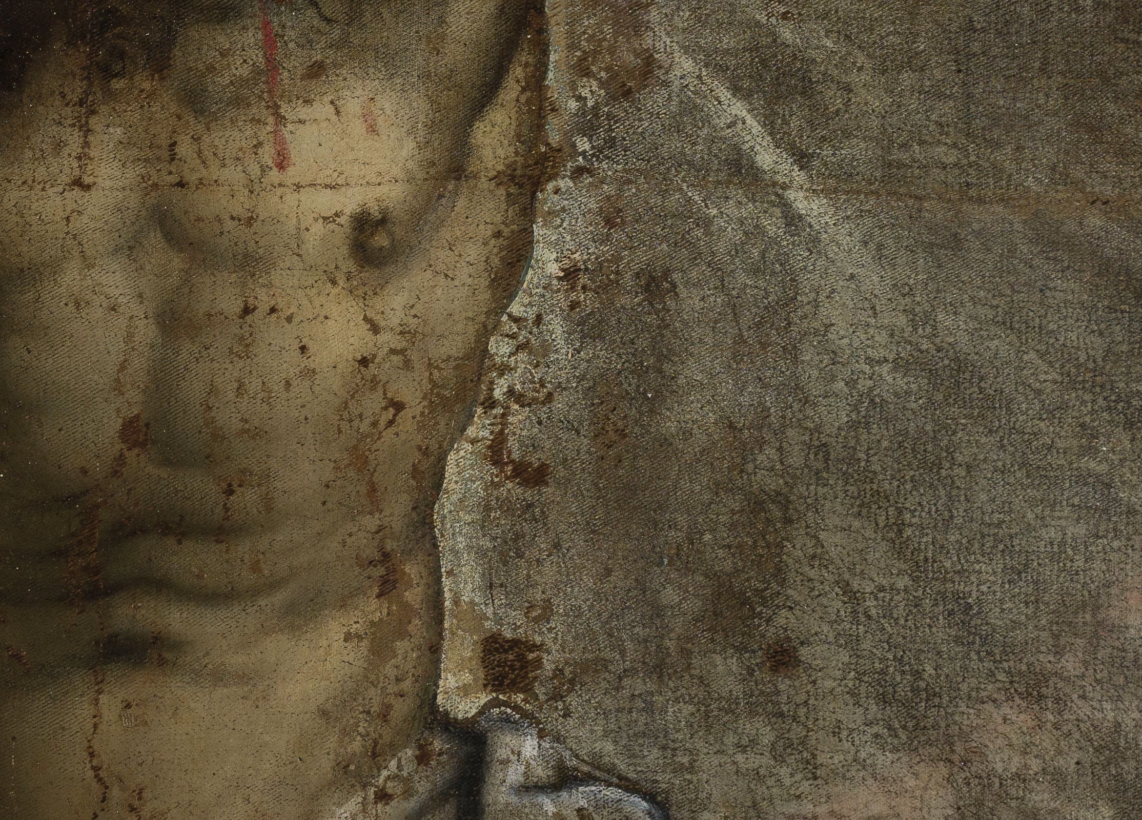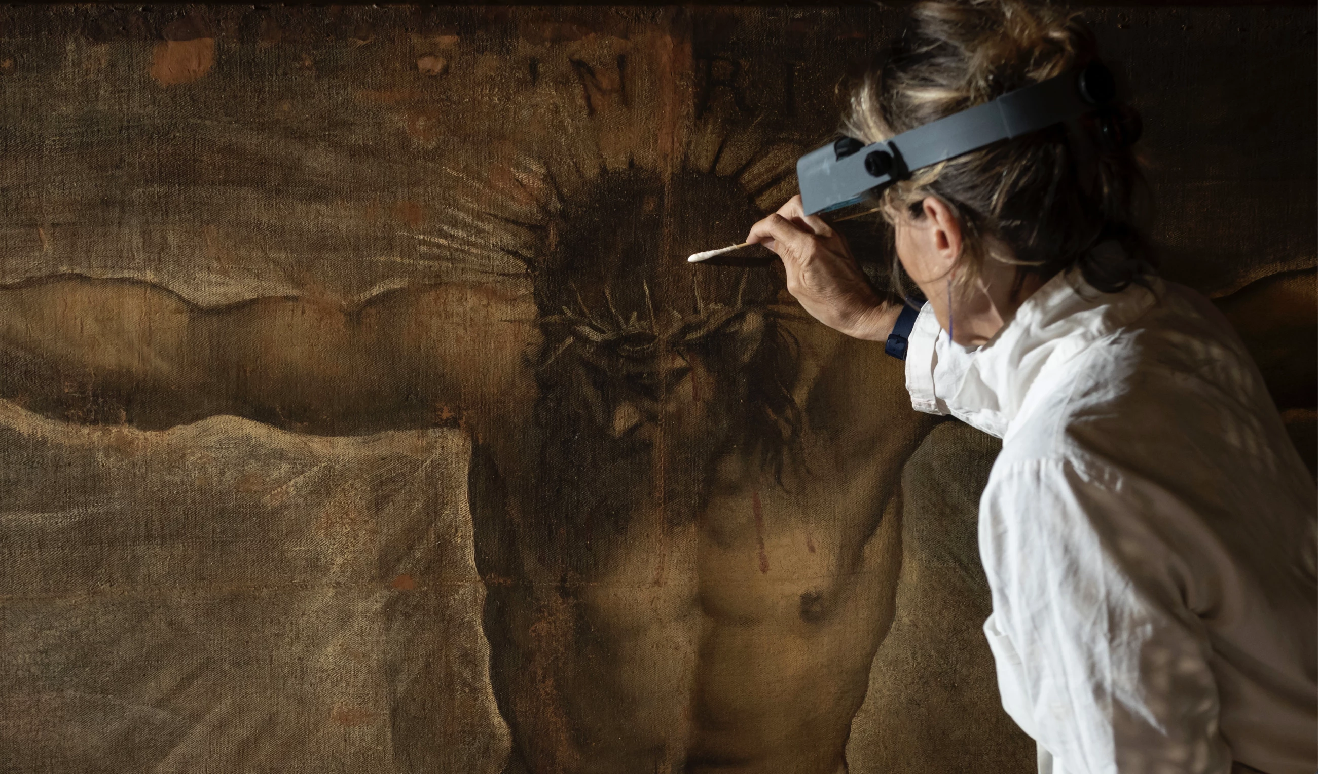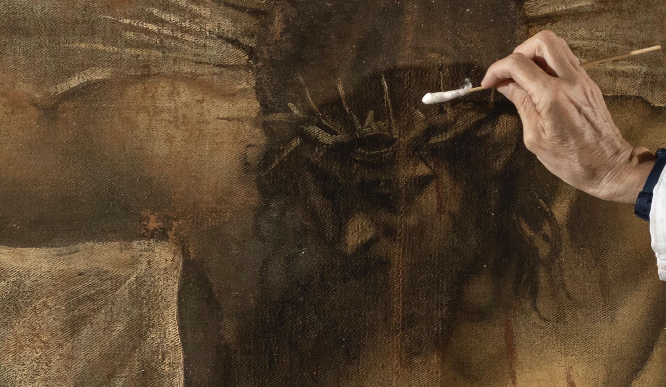 In early 2023, the CBC firm conducted a non-invasive diagnostic campaign on the painting, using ultraviolet and infrared (IR) photography to identify areas of damage and deterioration. Guided by these findings, conservation treatment began in spring 2023 to address multiple condition issues. The conservators faced numerous challenges: removing layers of yellowed varnish, glue residues, compacted dust, and discolored retouching left by earlier interventions. Only after this meticulous cleaning could they reintegrate areas of paint loss and abrasion—a careful process that concluded with the application of a protective final varnish. The team also carried out treatment on the painted frieze above the Crucifixion, ensuring the entire ensemble was restored to coherence.